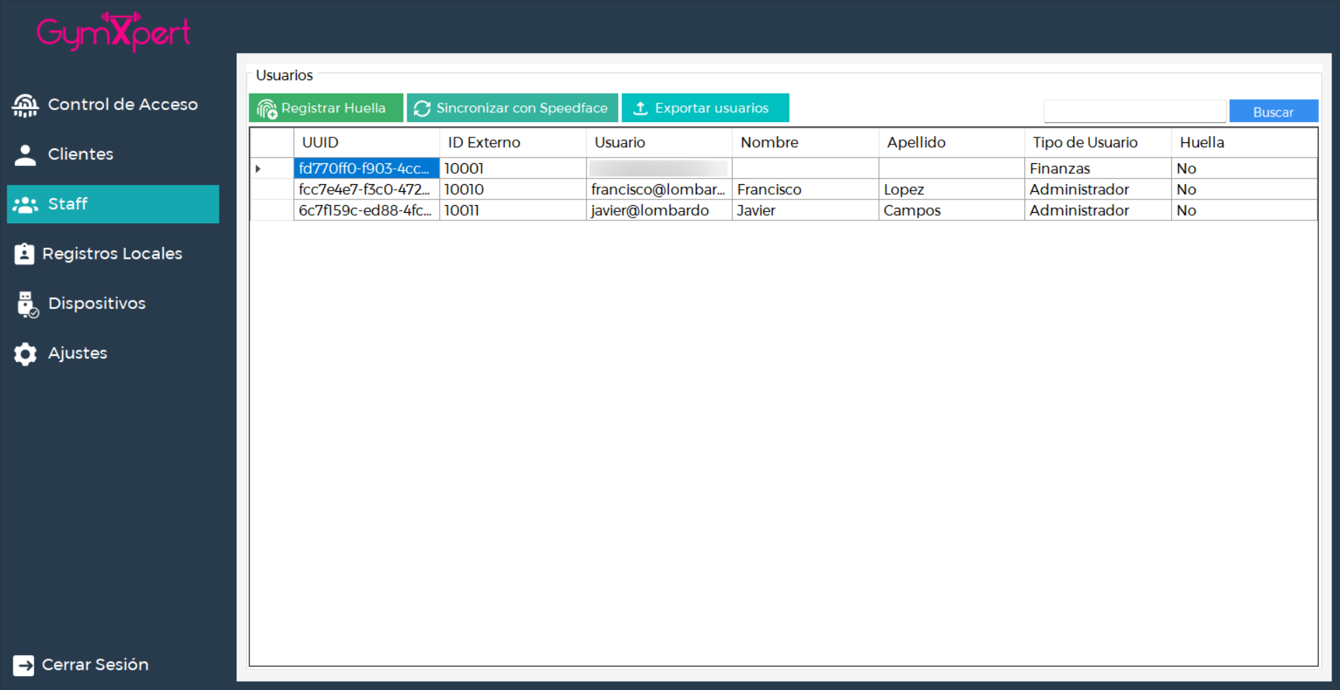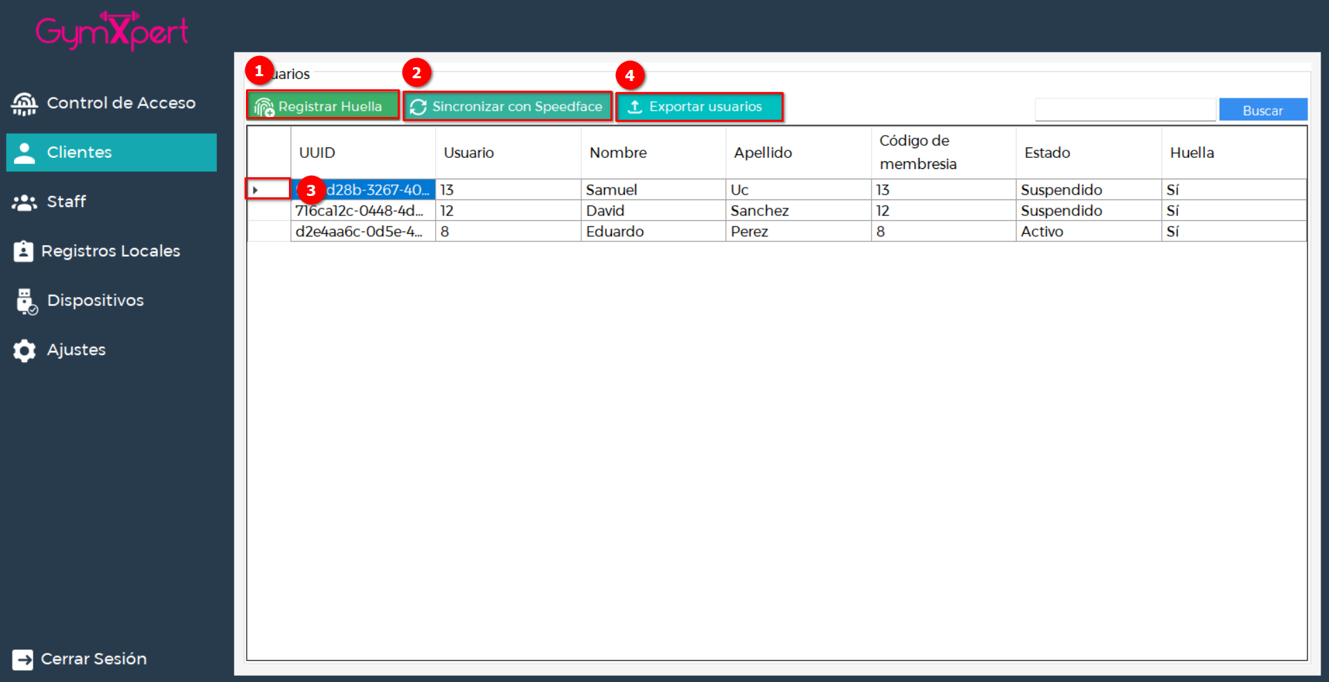 Aquí encontrarás la lista de clientes registrados en tu sistema GymXpert. Desde esta vista puedes consultar información básica de cada uno, registrar sus huellas y exportar clientes a lector de rostro Speedface.