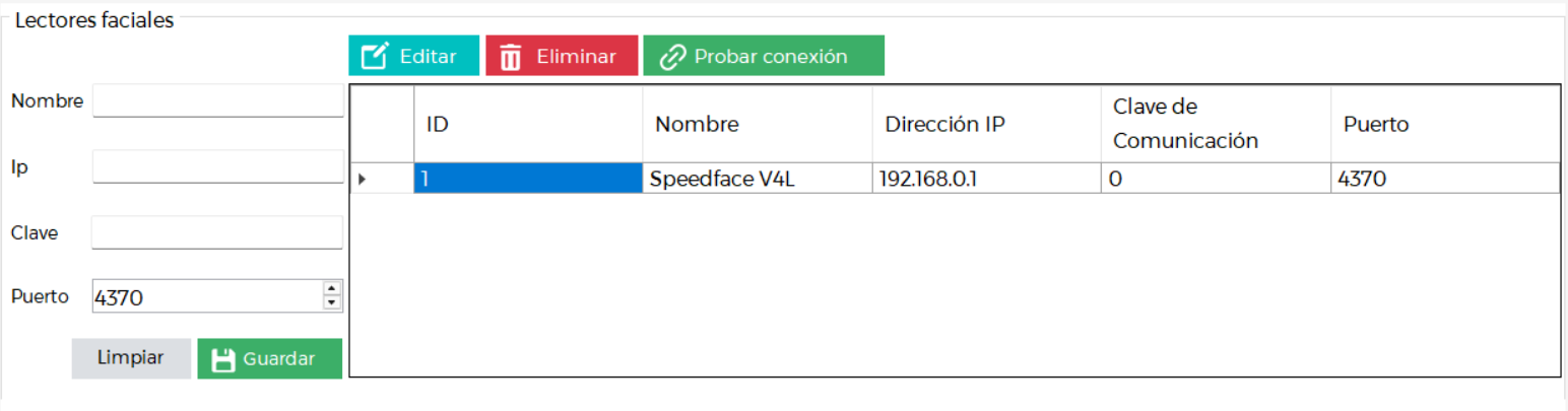 - IP: dirección IP del lector de rostro, es importante que el lector y la computadora esten conectados a la misma red