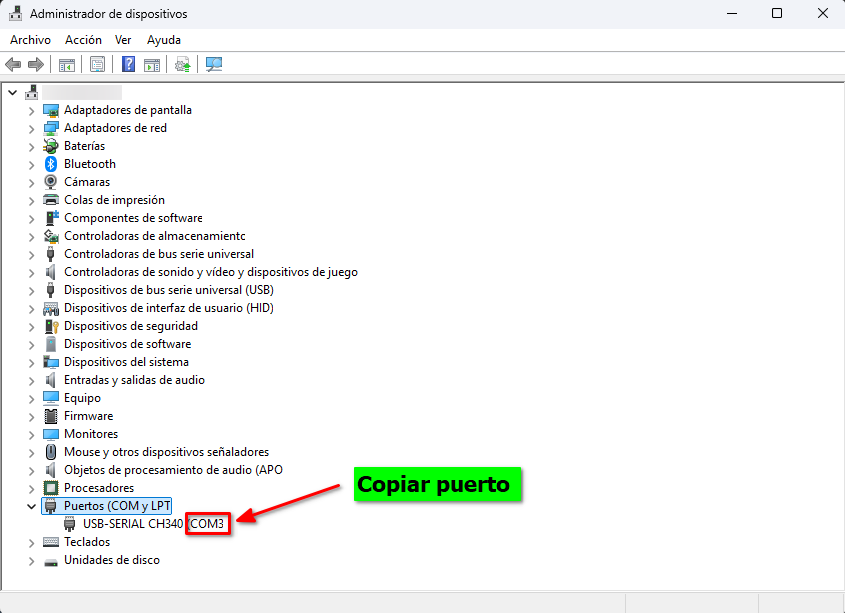 2. Identificar nuestra controladora y copiar el puerto COM que se encuentra entre parentesis