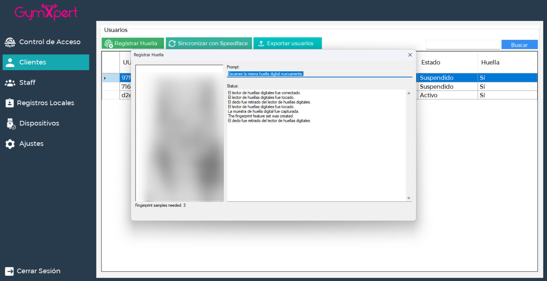 Al hacerlo, el sistema actualizará los datos y cargará todas las huellas registradas, incluyendo la del nuevo cliente. Desde ese momento, el acceso mediante huella funcionará correctamente.